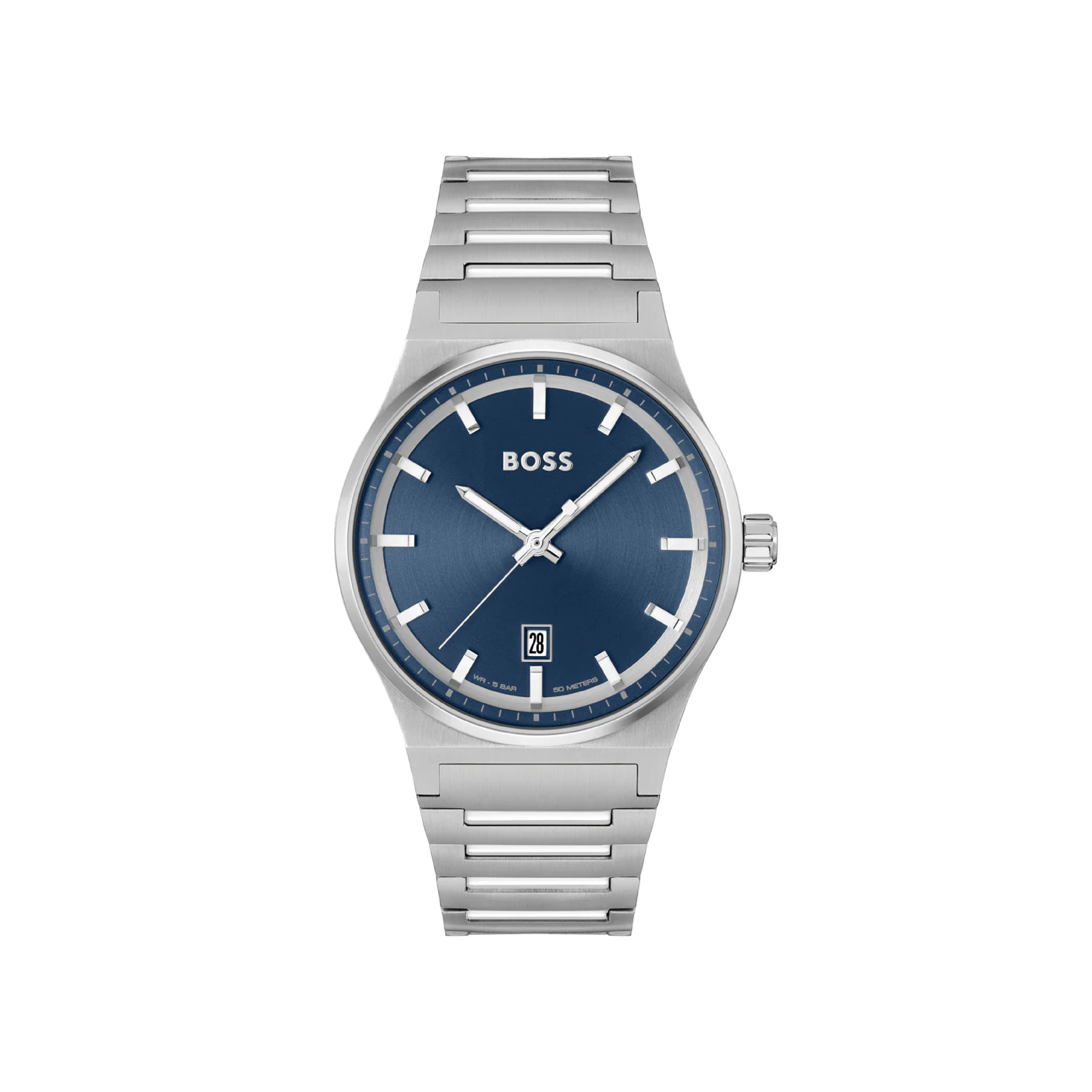 A link-bracelet watch in stainless steel by BOSS, set with a black groove-textured dial and engineered with a Japanese automatic movement.
